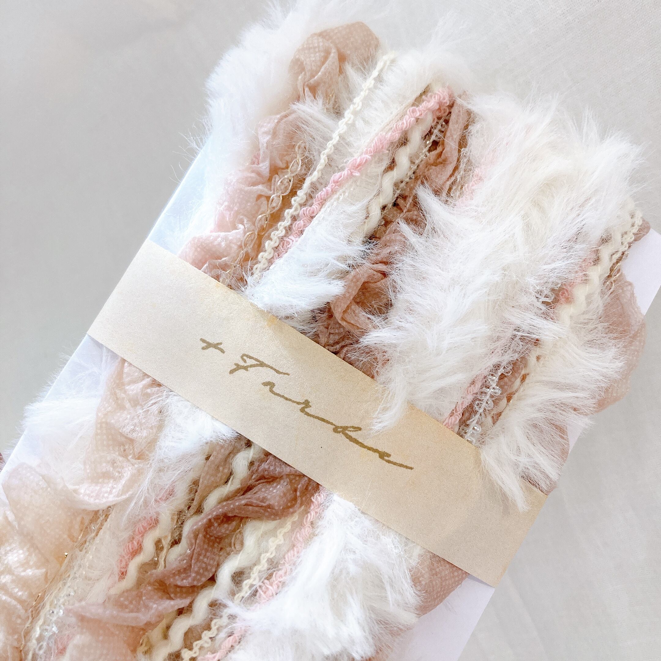 糸作家様からお譲り頂いた糸や糸屋さん等で購入した糸やリボン等を複数組み合わせて一つにしています。全て+Farbeの手染め糸とは限りませんのでご了承ください。
